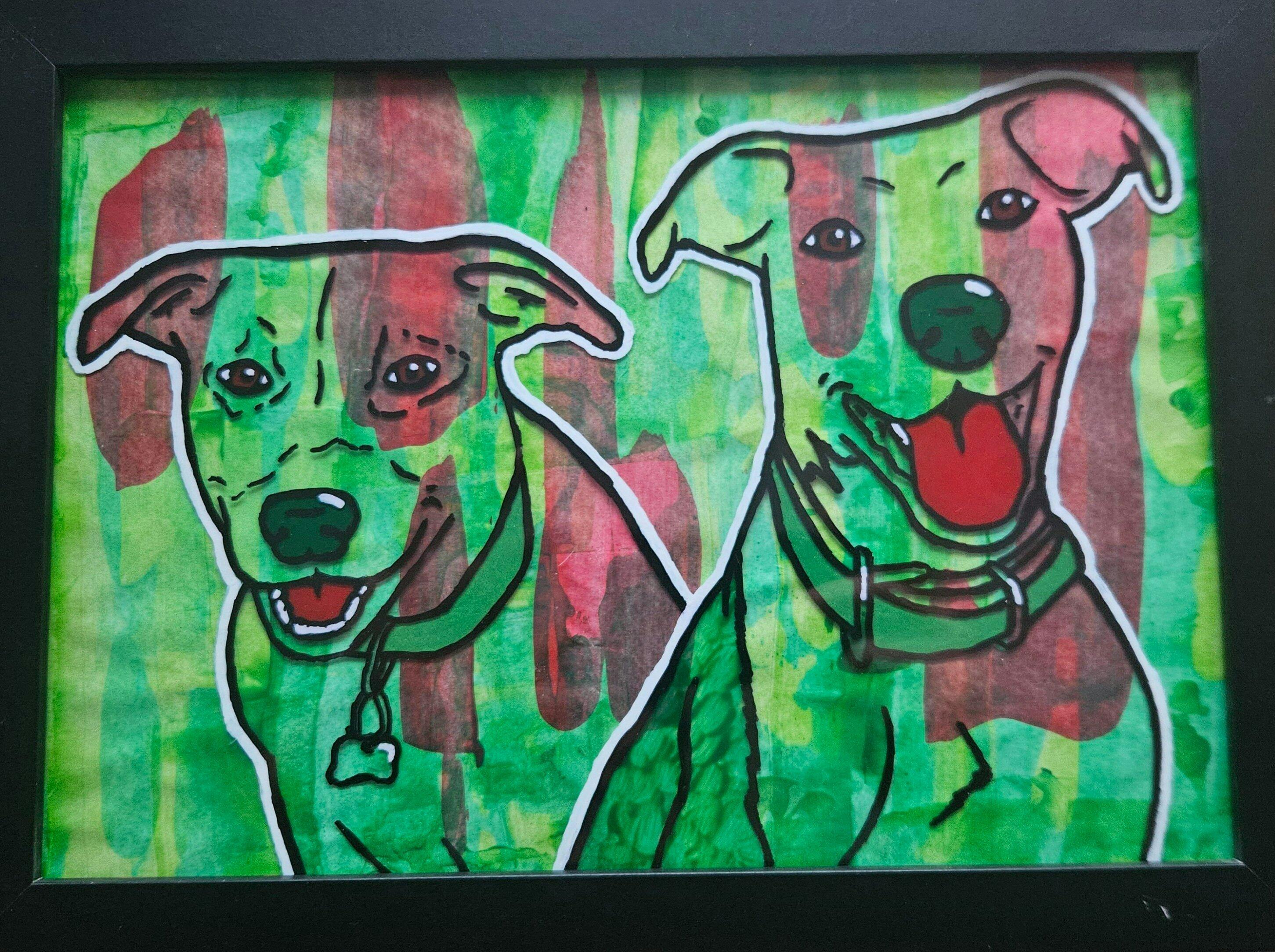I am very happy with my artwork from treasure tails! the attention to detail is very impressive, the artists got the unique traits of my two Australian shepherds that I can tell the difference between the two just by looking at them. This one is being displayed at the entry for everyone to see.